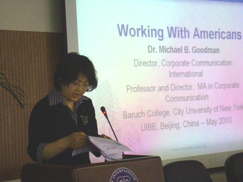 全国首届跨文化商务交际高级研修班于2010年5月20日8:30在诚信楼1412会议厅正式开班。来自全国各大高校的60名学员和我院20多位教师参加了此次研修班。研修班第一个工作坊于5月20日上午8:30-11:45进行,有两位主讲嘉宾,即纽约城市大学Baruch 学院企业传播中心主任Michael Goodman教授和我院商务英语系江春副教授。主持人为商务英语系副主任冯捷蕴博士。