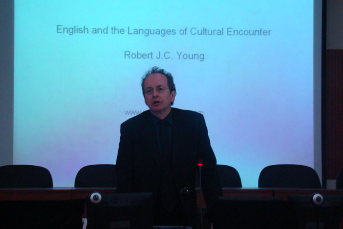 在讲座中,罗伯特•扬教授主要论述了英语和其他语言的文化冲突,并提出英语实际上是不同文化冲撞下的产物。从殖民角度来看,许多前英国殖民地国家的官方语言均是英语,这其实是一个殖民结果,迫使殖民地国家的作家使用英文进行写作。但是罗伯特•扬教授指出,英语作为一种语言受到了各种不同文化影响,在不断变化之中的。他向学生们展示了不同时代的文学大家的作品,通过细读及研究英语语言的使用来证明,即使是在普遍得到承认的标准英语作品中,拉丁文、法语、希腊语及不同的当地语言对英语的影响还是显而易见的。