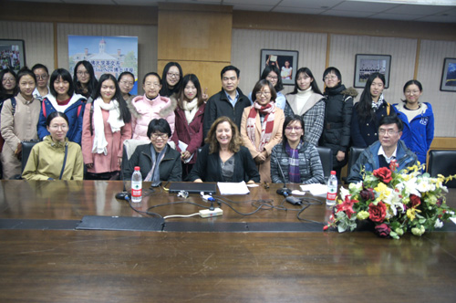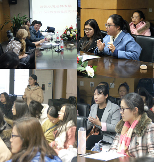 讲座的研讨部分由英美文学研究所所长金冰教授主持,蒋显璟教授,李靓副教授、邵凌副教授、兰翠竹老师、郭巍博士,李贺青博士、李铭博士等青年骨干教师及本科生、研究生等近六十人参加了此次讲座。在座师生纷纷踊跃提问发言,从惠特曼“自由体”诗歌的创作特点、嘻哈音乐对诗歌韵律的借鉴与传承、以及新媒体对于诗歌创作与诗歌研究的影响等诸多方面与Elisa New教授进行了深入互动和切磋。会后,ElisaNew教授与在场师生亲切合影留念,在场师生都表示受益匪浅。