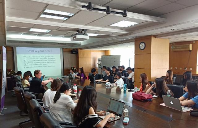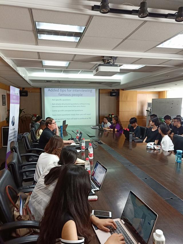 2018年6月14日下午,“对话VIP——怎样采访大国政要和行业精英”讲座在诚信楼1314会议室召开,本次讲座由我院国际财经新闻研究中心主办。应该中心主任、语言文学系副主任、传媒教研室主任钱晶晶老师的邀请,原美国新闻记者论坛主席、清华大学国际财经新闻硕士项目外方主任瑞克·戴(Rick Dunham)教授作为嘉宾为大家主讲,钱晶晶老师主持本次讲座。