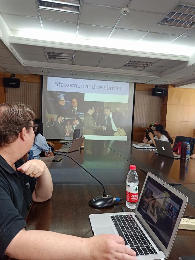 活动一开始,钱老师先以美国经典政治剧《白宫群英》中白宫新闻发言人每日的新闻简报开场,请Rick教授点评。Rick教授结合剧中内容,兴致勃勃地为大家描述了他作为《商业周刊》驻白宫记者时的所见所闻。其中,教授详细介绍了白宫东、西两翼的历史渊源,还详细介绍了白宫新闻发言人向各大媒体驻白宫记者团发布消息的会议场景,向大家真实展现了他当时驻白宫首席记者的工作日常。