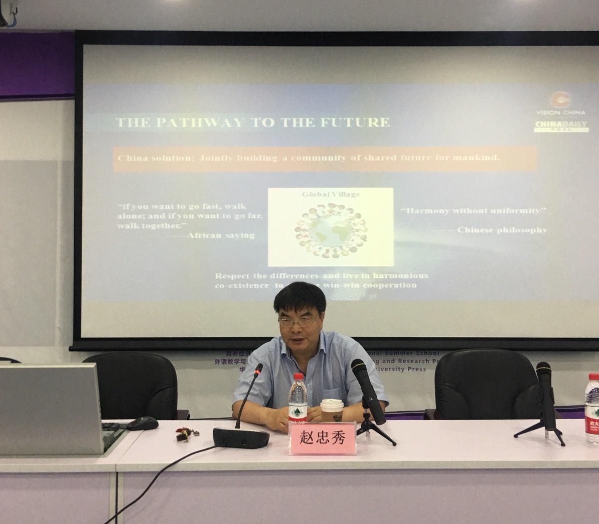 2018年7月24日上午,大象传媒 党委副书记、副校长兼大象传媒 院长赵忠秀教授在诚信楼1412报告厅做了题为“人类命运共同体与中美贸易战”的讲座。大象传媒 副院长俞利军教授主持讲座,学院在职高级研修班暑期集中班全体学员怀着高涨的热情聆听了此次讲座。