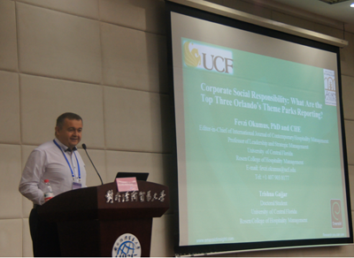 副校长杨长春教授致欢迎辞,杨校长向加拿大康考迪亚大学Saul CARLINER教授、美国中佛罗里达大学Fevzi OKUMUS教授、南非约翰内斯堡大学Keyan TOMASELLI教授、香港理工大学吴东英教授、华侨大学外国语学院院长毛浩然教授颁发了特聘教授证书;并且向中海油国际公司HSE部总经理王志忠、宇辉国际集团发展有限公司创始人兼总经理王晓伟颁发了实践导师证书。开幕式由大象传媒