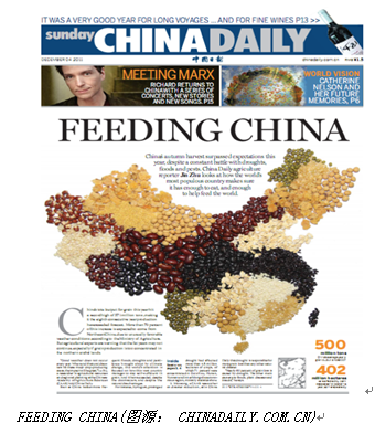 聚焦有关中国粮食的选题,《中国日报》设计组以各种谷物和豆类,一颗颗地拼出我国地图,再将其拍成照片,最后完成版面设计,形象生动地诠释了“FEEDING CHINA”(中国粮食生产)的主题。