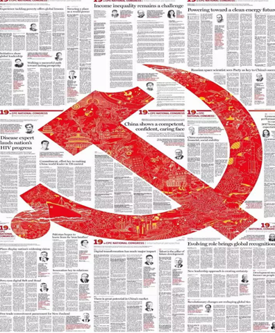 田驰老师首先分享了版面设计的风格与水平对媒体形象的定位与塑造能力。在案例间的对比中,田老师为大家生动展示了设计是如何通过图片、图表、创意插画等视觉元素,将新闻要素准确、直观、美观地传达给读者。给大家印象最深的,莫过于该报对十九大设计的专题版面系列,这个精心设计的版面系列中,每一版都是党徽的一部分,将整个系列合起来,就是完整的党徽(如图),这种用心的工匠精神和精巧的设计思路,让在场的老师和同学连声赞叹。