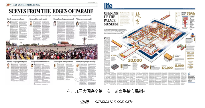 此外,田老师为大家介绍《中国日报》精心设计的“九三”大阅兵全景、故宫手绘布局图等切合题旨又独具匠心的设计,再一次让老师和同学们赞声连连。