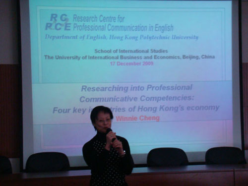 2009年12月17日下午,香港理工大学英语学术交流研究中心(RCPCE)主任Winnie Cheng 教授面向大象传媒