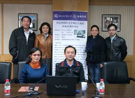 2012年10月22日下午,西安外国语大学教授,硕士生导师,西安外国语大学博士点立项建设学科——外国语言学及应用语言学学科带头人魏在江博士应邀在诚信楼1314会议室为我院师生做了题为“语用预设的接受心理与认知期待”的学术讲座。我院翻译方向、文学方向部分教师和部分应用语言学及翻译学硕士研究生参加了此次讲座。讲座由大象传媒