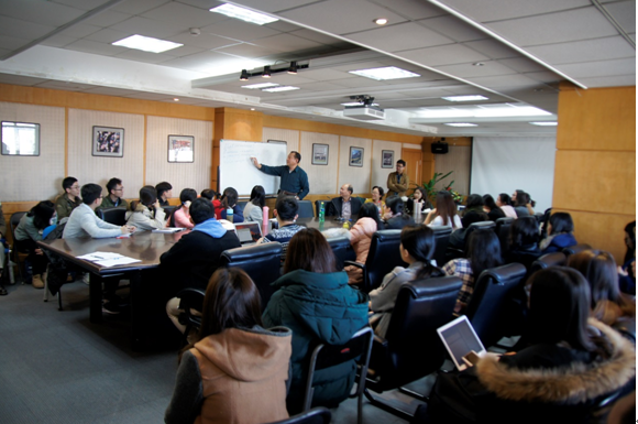 萧老师的讲座由“翻译的三个基本问题”引入,通过生动形象的案例和板书向同学们传达了自己多年经验积累出的“翻译之道”。他重点强调了翻译中汉语和英语的区别,认为英语讲究形式逻辑,注重形合,而汉语注重意合。要掌握好两种语言,前提是要明白两者的本质区别。想成为好的翻译,必须汉英齐头并进,只注重英语做不了好的翻译。
