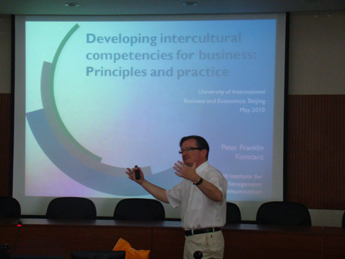 主讲人Peter Franklin教授是德国HTWG Konstanz应用科学大学(HTWG Konstanz University of Applied Sciences)教授,专门从事跨文化商务和管理交际的研究,是跨文化管理、价值观和沟通学院的共同创始人,是Delta 跨文化研究院主任兼编辑,2009年与Helen Spencer-Oatey 合作出版了《跨文化沟通:跨文化交际的综合学科研究法》一书。他具有丰富的培训经验,自1989年以来,曾对众多的国际企业和机构客户提供咨询、培训和讲座。