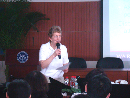 Helen Spencer-Oatey教授为前来参加研究班的全国多所院校的老师及研究生主讲的题目是Practicalities of Intercultural Research 和 Communicating Effectively in International Teams。Spencer-Oatey教授重点讲述了跨文化研究的设计,内容涉及跨文化交际研究中可能出现的问题和影响因素以及数据的采集等方面的问题,且与学员们一起以问卷翻译的对等性为例对数据采集过程中容易出现的问题进行了研讨。
