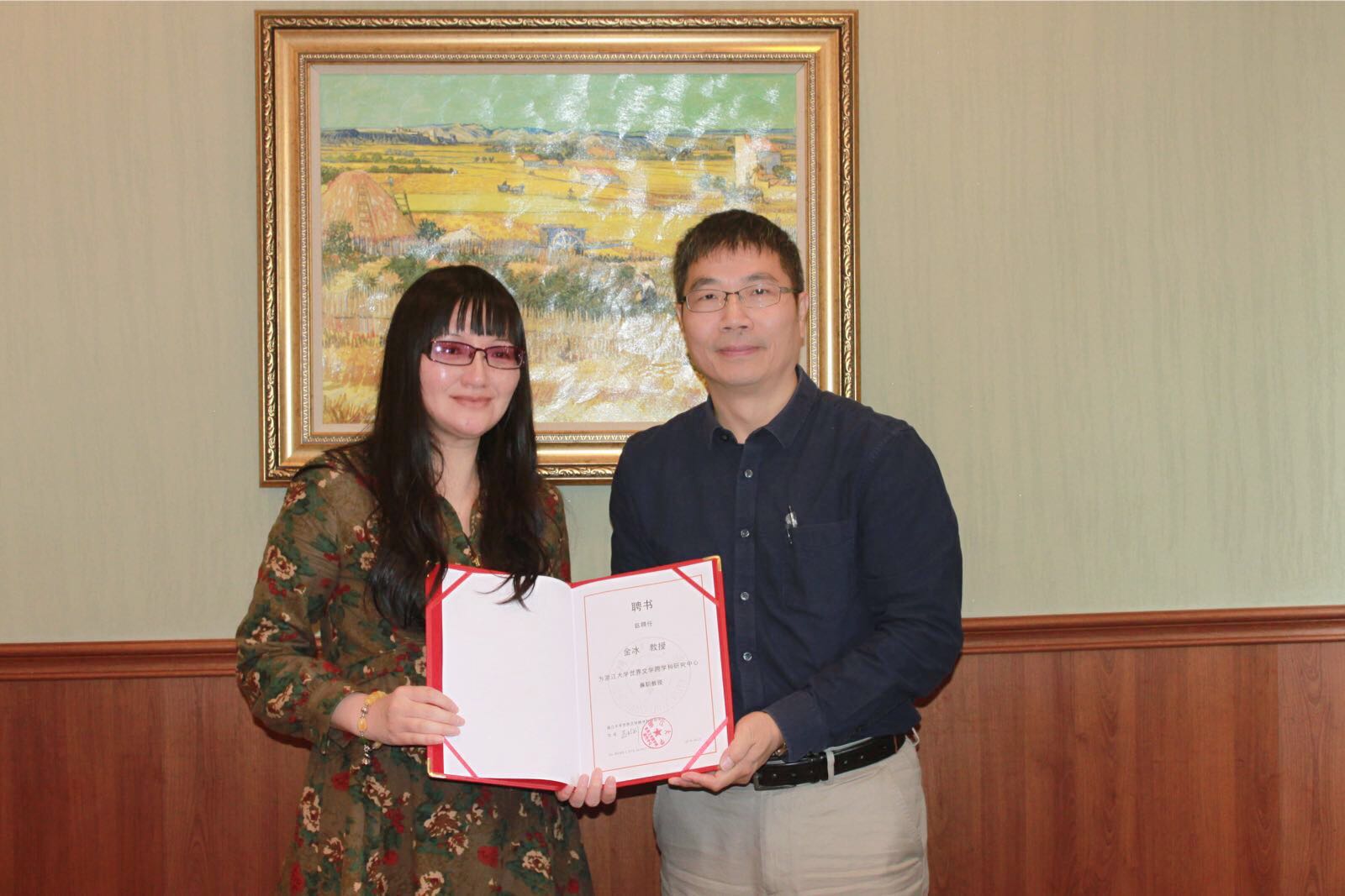 此次年会前,金冰教授还应邀参加了浙江大学世界文学跨学科研究中心主办的“跨学科研究协同创新”高端论坛,并受聘为浙江大学世界文学跨学科研究中心兼职教授,浙江大学罗卫东副校长为金冰教授颁发了聘书。浙江大学世界文学跨学科研究中心是我国文学跨学科研究领域的顶尖学术机构,该中心拥有一支专业的文学跨学科研究队伍,在聂珍钊教授的带领下创立了A&HCI期刊《文学跨学科研究》,引领了国内文学跨学科研究的导向,并在国际上建构中国特色的文学话语体系。此次金冰教授受聘为该中心兼职教授,有助于拓宽我校与浙江大学人文研究领域的合作空间,在优势互补的基础上,共同发展,以期在新时期跨学科研究领域取得更多成绩。