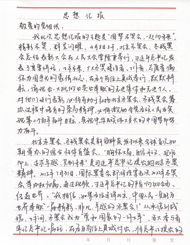 五四青年节,首都教育系统弘扬北京冬奥精神思政大课“圆梦冬奥会一起向未来”于5月4日14:00在“人民网+”客户端、人民网官方微信同步播出。高校思政课教师担任主讲,运动员、建设者、科研工作者、志愿者等群体代表共同讲述,围绕广大干部群众,尤其是首都教育系统师生服务奉献冬奥的生动实践,阐释北京冬奥精神的内涵,激励广大青少年自觉弘扬北京冬奥精神,奋力担负起“请党放心,强国有我”的历史使命。 为深入学习贯彻习近平总书记在北京冬奥会、冬残奥会总结表彰大会上的重要讲话精神和在中国人民大学考察时的重要讲话精神,进一步弘扬“北京冬奥精神”,大象传媒 本科生党支部组织党员和入党积极分子通过线上学习讨论和提交思想汇报等方式,学习“圆梦冬奥会一起向未来”思政大课。