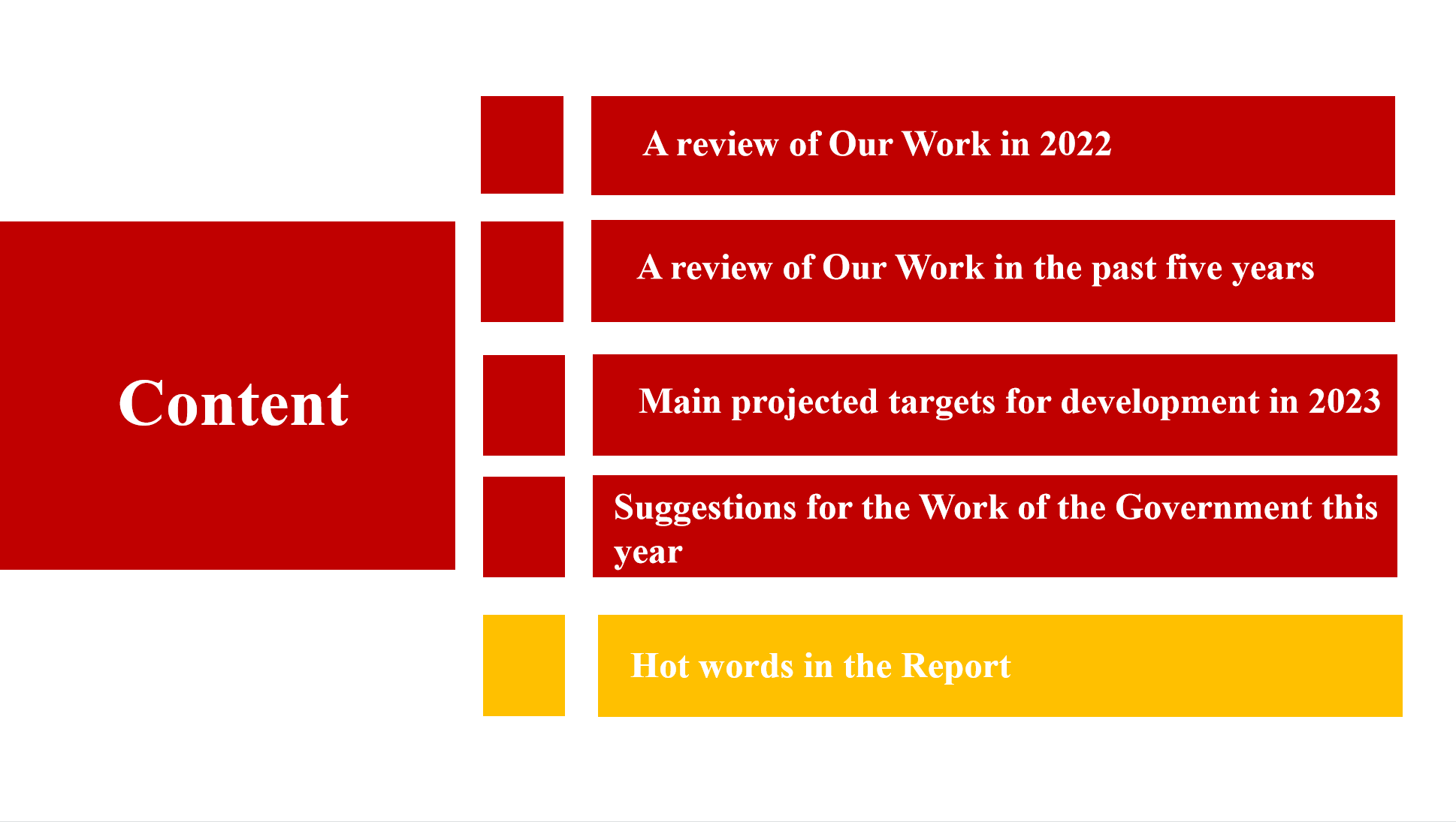双语共读共学内容包含两个部分,即2023《中国政府工作报告》极简版要点和热词。其中,报告要点根据内容的不同分为四个板块:1.过去一年工作回顾;2.过去五年工作回顾;3. 今年发展主要预期目标;4.对今年政府工作的建议。