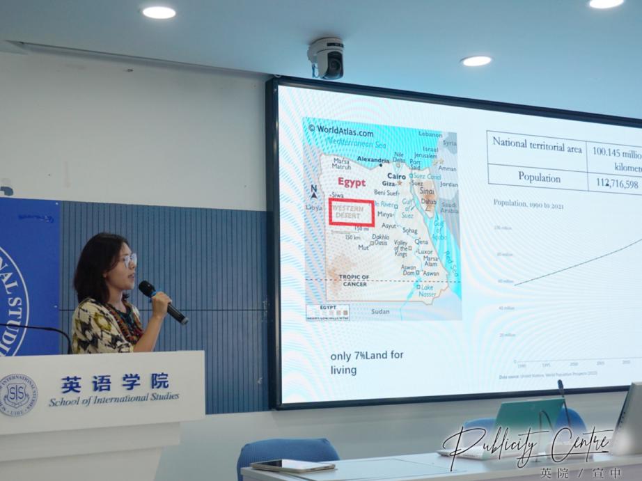 第五位上场的是沙依拜·阿不都同学,她从埃及的基本情况讲起,介绍了埃及的地理位置、人口和生态,并结合家乡吐鲁番的发展和参加文化遗产保护论坛的个人经历,体现了“一带一路”发展下两国的繁荣。她精彩的演讲配合优美的音乐打动了在场的所有观众。