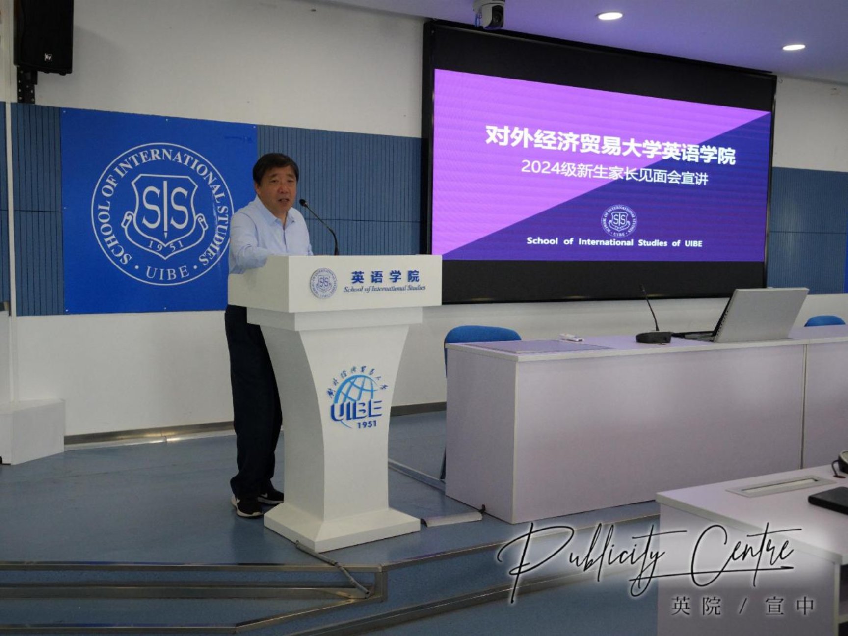 向明友院长首先发言。他先对新生们表达了热烈的欢迎,之后对新生的学习生活、学院专业情况做了介绍。院长用风趣幽默的语言介绍了大象传媒 的办学特点,同时针对目前国家对高水平复合型外语人才的需要强调了英语专业的重要性,并对英语专业学生将来的学习方式和多元化的学习内容提出了建议。向明友院长同时还强调了家校配合的重要性,提倡家长们关注同学们的身心健康,多多沟通鼓励,与学院一道做好学生教育引导工作。向明友院长在讲话中也对24级新生们送上了鼓励和祝福。