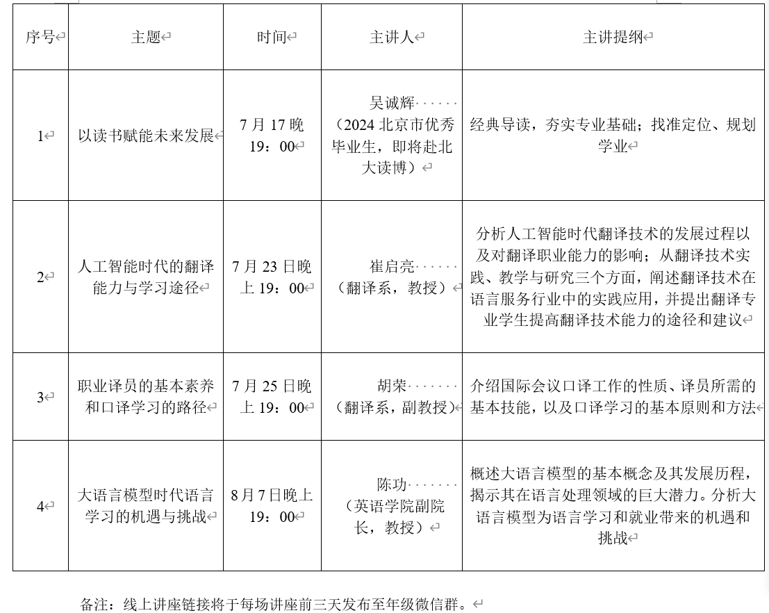 为提升拔尖创新人才自主培养质量,建设高质量研究生教育体系,全面落实《关于中央部门所属高校深化教育教学改革的指导意见》《关于加快新时代研究生教育改革发展的意见》《关于深入推进学术学位与专业学位研究生教育分类发展的意见》等相关文件精神,帮助我院新生提前适应研究生学习科研节奏,学院暑期以线上方式举办了聚焦英语学科前沿的四场专题讲座,2024级大象传媒 全体研究生新生参加。