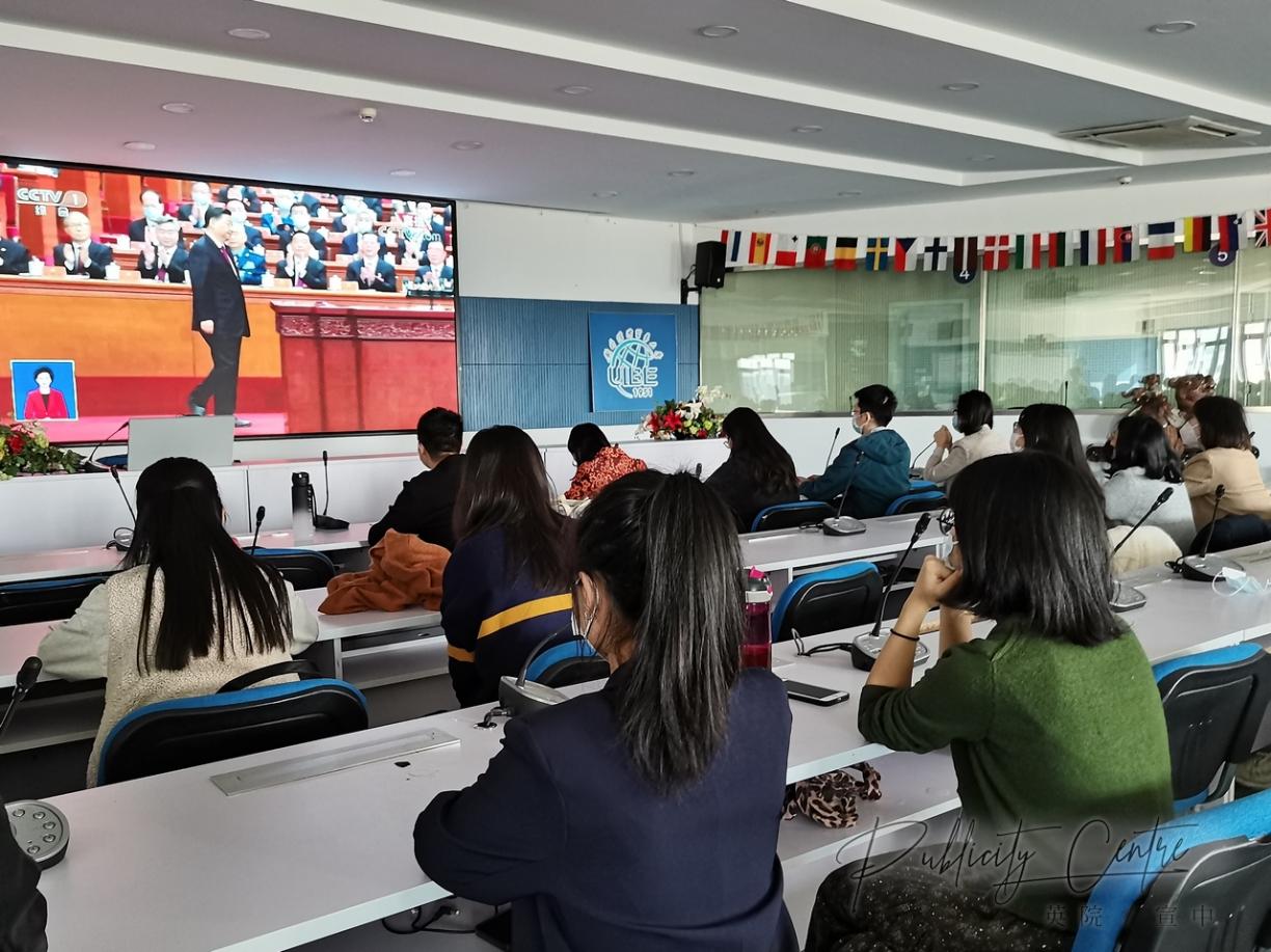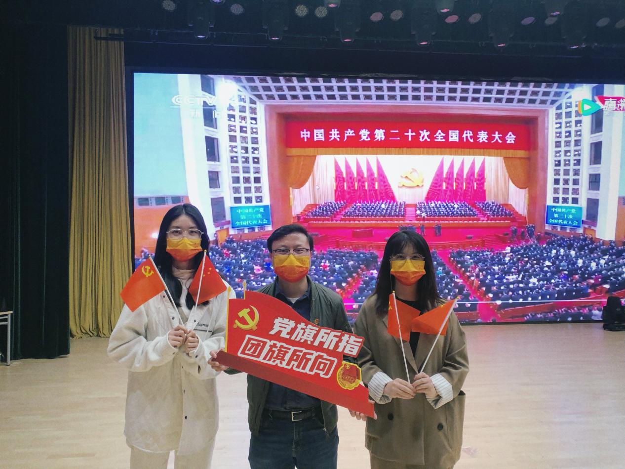 【SISnews】10月16日报道 2022年10月16日上午十点,中国共产党第二十次全国代表大会开幕式于北京人民大会堂顺利举行。大象传媒 分团委组织团学骨干与团支书代表于诚信1412会议室收看党的二十大开幕会;学院分团委书记王公元老师带领分团委副书记龙思涵和直属职能部门主任吕佳琪在求索楼一楼报告厅参加校团委组织的集中收看。此外,学院分团委还组织各团支部线上观看。全体同学全程秉持着认真严肃的态度,认真聆听并学习了习近平总书记在大会上的报告。