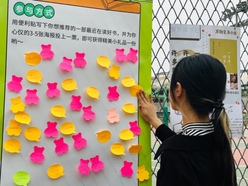 浓厚的读书分享氛围蔓延在每一位驻足同学的身边。也许是深受共读者们的启发,大家欣赏完推荐海报后纷纷来到展板前,积极用便利贴写下自己想推荐的一本好书。展板上的便利贴越来越多,推荐书目的类别也包罗万象,读书分享带来的快乐洋溢在四周,让路过的每一个人都受其感染,激发出多读书、读好书的热情与动力。下午13:30,本次读书推荐海报展出评选活动圆满收官,每一位参与者都收获满满。
