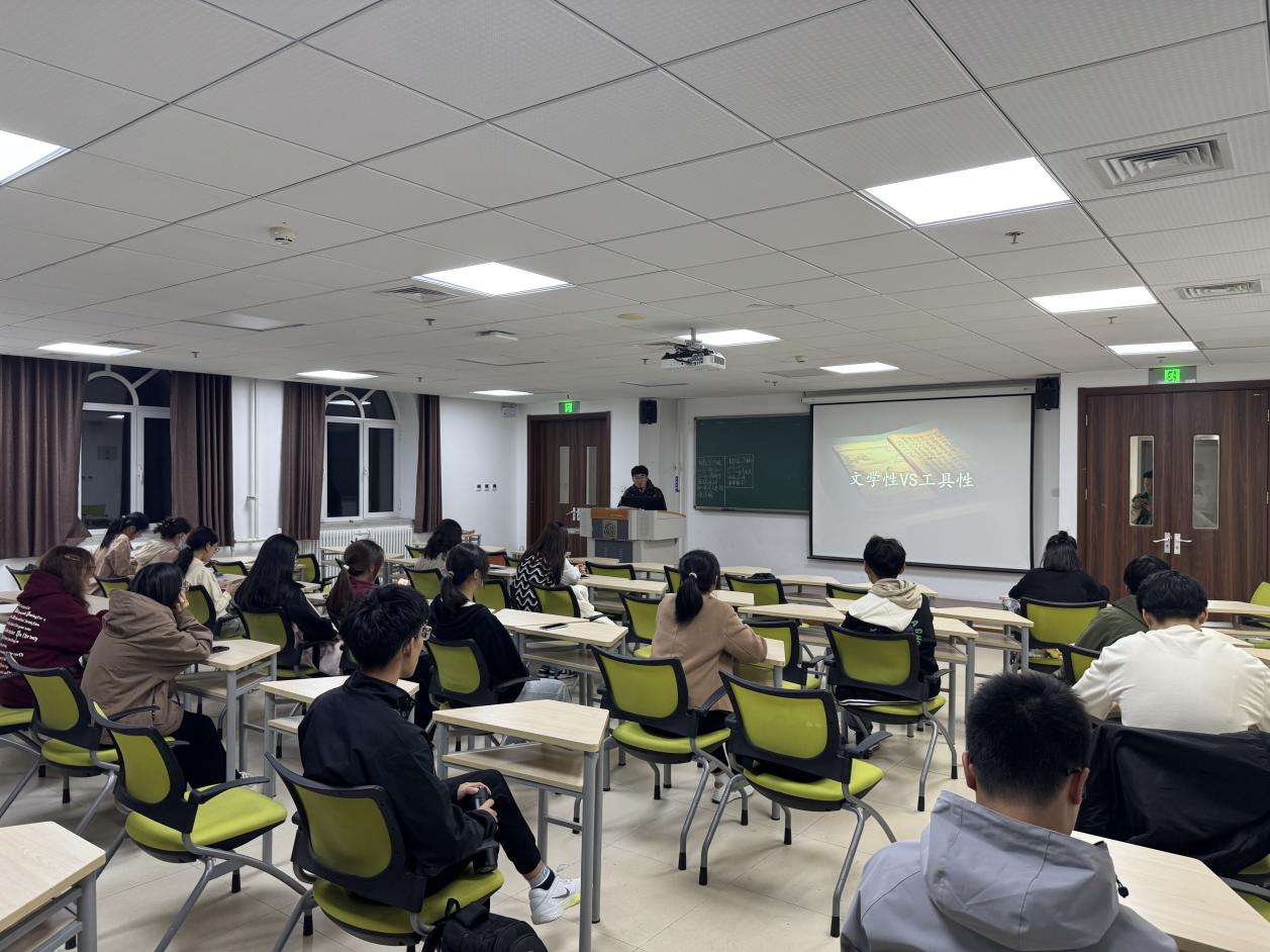 会上,朱倩妮同学首先分享了《古籍原来这么好看》的观后感悟和自己对于古籍的认识与思考,李雨轩学长在讲台上倾情演讲,对朱倩妮同学的分享做了一些补充,从对文学性书籍和工具性书籍的角度分析了这本书的亮点所在,并将自己求学的经验倾囊相授,帮助大家更清晰的规划未来的求学生涯。