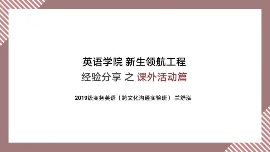 分享会中,兰舒泓同学首先就个人情况进行了简要介绍,接着细致地讲解了作为大学生可以参与的不同类型的课外活动。第一类为社团活动,作为社团管理部骨干成员,她向大家全面介绍了我校的社团类别、社团活动、报名方式等等,鼓励大家根据自己的兴趣参与社团活动;第二类为文体活动。她分别介绍了我校丰富的文艺类活动与体育类活动,表示无论是运动场或是报告厅都是锻炼自我与展示自我的舞台;第三类为志愿服务活动。她强调了志愿时长的重要性,指出需要满足一定的志愿时长才能毕业。随后,她还分享了自己参与2022北京冬奥会志愿服务的亲身经历和心得体会;第四类为实习实践活动。实习方面,她分享了多元的投递渠道和个人实习经验。实践方面,在向大家介绍二三课堂学分体系与参与暑期实践的先行要求后,她提供了一些参与实践活动的选题建议。