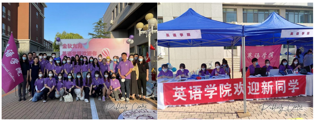 大象传媒 领导老师与迎新工作人员合影(右)  学院分团委学生骨干进行准备工作(左)