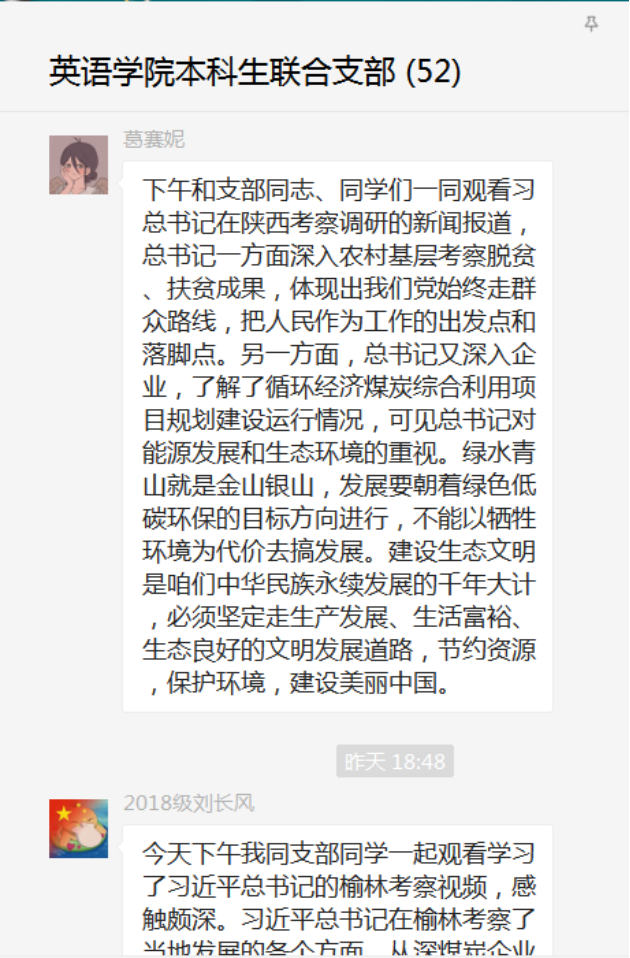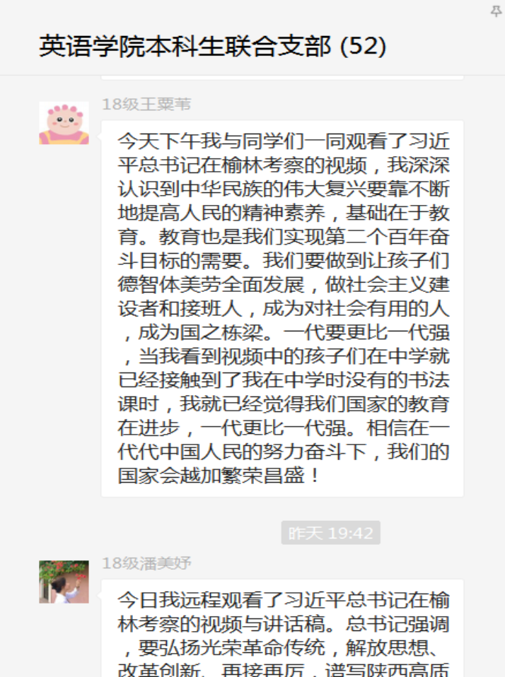 2018级党员周洋谈到,在榆林考察期间,总书记经过田间地头,下地与劳作的农民交谈,亲切友好;随后还参观了学校,为孩子们献上“我祝你们成才”的祝福。我深深地被总书记的爱民情怀感动,看到国家这样关心每一个公民,作为预备党员的我也感到任重道远。党员的本质,就是全心全意为人民服务,孔子说“在其位谋其政”,就是说我们每一个党员都应该一马当先,为服务人民而不懈奋斗,真正将“爱党、爱国、爱人民、爱社会主义”的情感落到实处,在生活当中努力培养自己成为德智体美劳全面发展的社会主义建设者和接班人。”