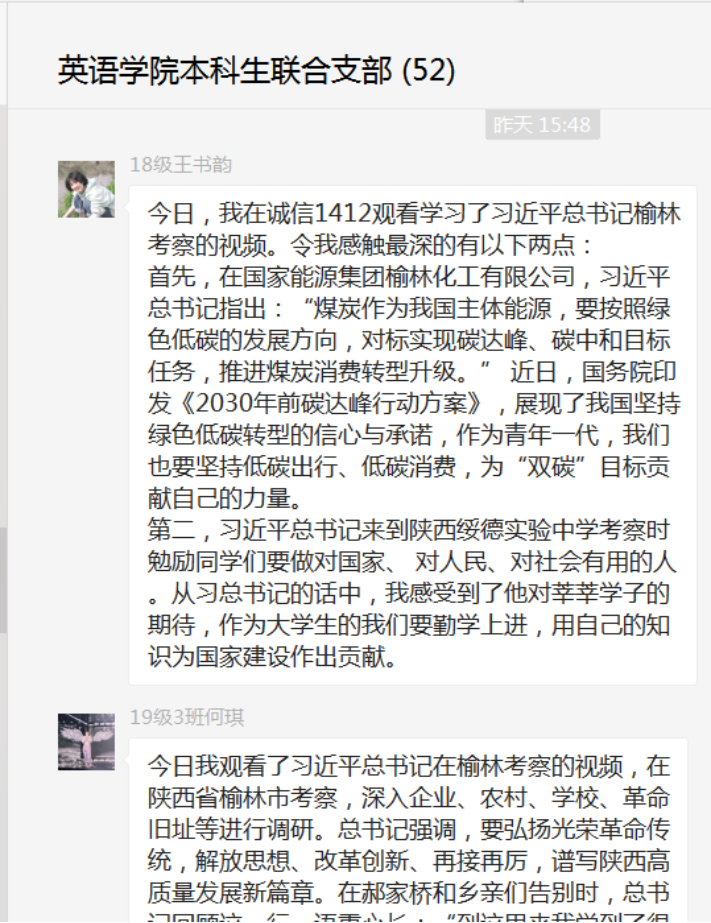 2018级党员李泽宛谈到,习总书记深入农村基层,考察脱贫工作进展与成果,强调要坚决落实党中央决策部署,坚持稳中求进工作总基调,更好统筹发展和安全,更好服务和融入新发展格局,谱写陕西高质量发展新篇章。我深刻认识到科技创新、创新驱动发展战略对可持续健康发展有着至关重要的作用,更进一步感受到,中国共产党时刻不忘全心全意为人民服务宗旨,一心为民谋幸福,为国谋发展。作为中共党员,我也要时刻牢记党员义务,关注党的政策,紧跟党的步伐,为祖国发展做出贡献!
