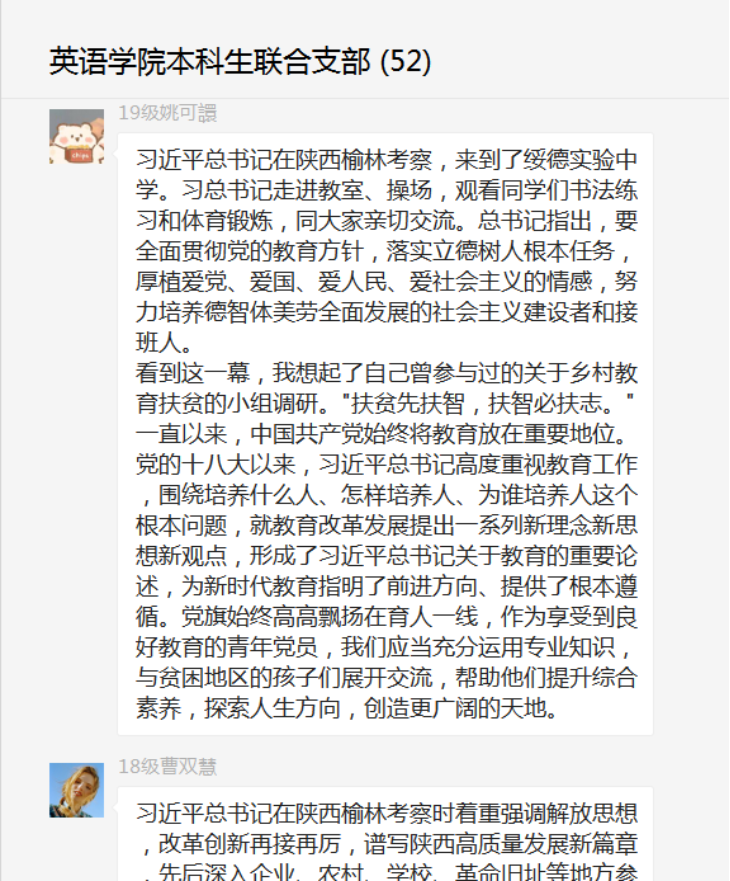 2019级党员兰舒泓谈到,令我印象最深刻的是总书记于绥德实验中学同师生们亲切交流的场景。他表示,要深化教育教学改革,落实立德树人根本任务,厚植爱党、爱国、爱人民、爱社会主义的情感,努力培养德智体美劳全面发展的社会主义建设者和接班人。总书记的谆谆教诲,让我深受教育。我们要深刻领会习近平总书记的重要讲话精神,牢记初心,修身立德、勤学上进,珍惜大好年华,成长为对国家、对人民、对社会有用的人。