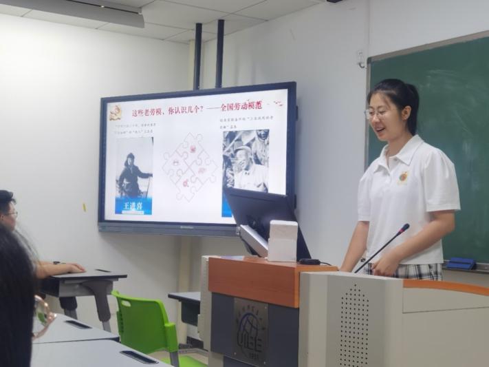 最后,张文程同学针对“必须坚持人民至上”分享了自己的见解。她用一位位耳熟能详的老劳模,向这些劳动模范的精神致敬,启发大家身为青年学生要不怕苦不怕累,奋斗是青春最亮丽的底色。张文程同学还通过《觉醒年代》中的一小段镜头,让新生们体会到那一段波澜壮阔的岁月对中国人的觉醒起到的重要作用。
