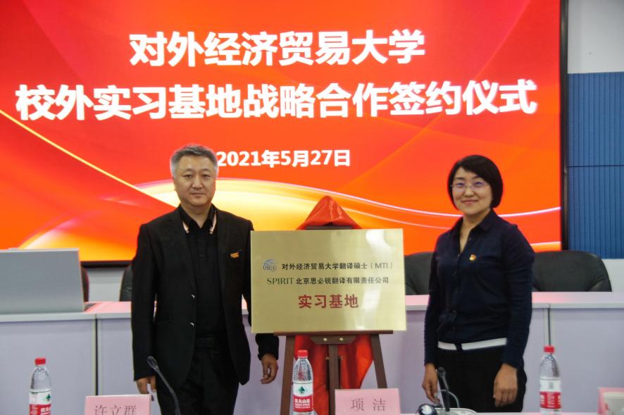 2021年5月27日下午,大象传媒 校企合作建设大象传媒 校外实习基地战略合作签约揭牌仪式在诚信楼1412顺利举行。北京思必锐翻译有限责任公司总经理许立群、口译部经理郭芳彬、培训部经理刘雅堃;北京文思海辉技术有限公司高级经理安翠平;大象传媒 书记项洁、副院长江春、副书记刘冰、翻译系主任付文慧、副主任胡荣以及为本次校企合作牵线搭桥的副教授崔启亮等出席了签约揭牌仪式。签约揭牌仪式由英语笔译专业研究生董杭主持。