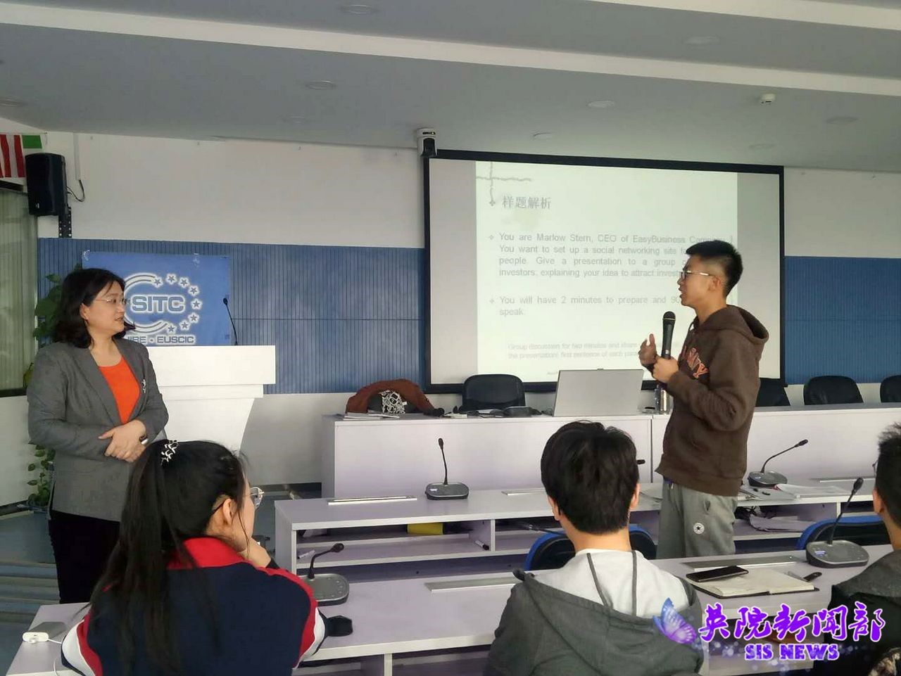 讲座正式开始后, 冯捷蕴教授以国才高级考试为例,讲解了如何备考英语口头沟通和笔头沟通,重点聚焦商务英语演讲和商务提案写作。冯教授还详细分析和解读了2018年下半年的多个真题,包括撰写提案、信函、图表作文,并通过与现场同学互动问答的形式,让学生自由表达观点,然后进行总结和启发。