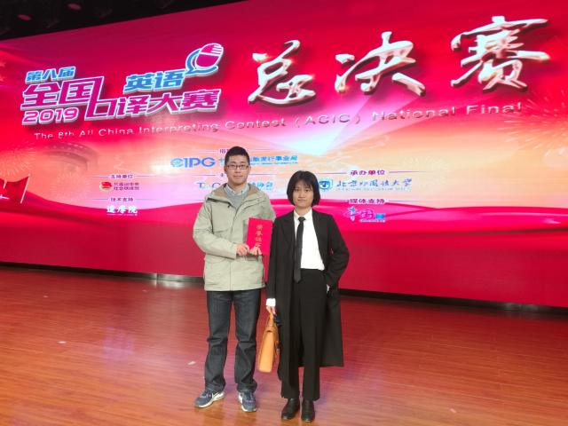 英语口译专业(国际会议口译方向)2018级研究生、中欧高级译员培训中心学员蔡敏和钟霏钒两名选手凭借出色的专业水平和稳定的现场发挥,分别取得了同传邀请赛一等奖亚军和交传总决赛二等奖的优异成绩。
