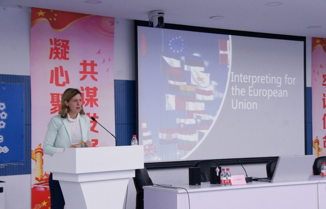 中欧高级译员培训中心是我校与欧盟口译总司共同举办的高端国际会议口译培训项目。中心每年定期邀请欧盟口译总司资深译员到访我校进行教学访问并组织相关模拟会议。此次模拟会议帮助学员加深了对一线译员工作内容及相关要求的了解。模拟真实的会议场景还有助于学员了解真实的口译工作环境,进一步提高了学员的临场应变能力和综合口译技巧。