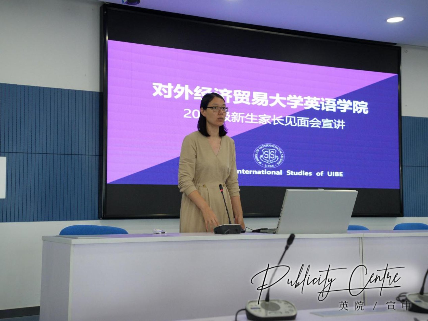 之后是赵丹彤副院长讲话。她从工作的实际出发,就会前收集到的人才培养相关的问题进行讲解。讲解的内容包括大类分流、双学士学位以及辅修等学习制度。她也提到了学院为了提升学生英语水平所采取的一系列教学方法,同时建议各位家长引导同学及时关注,合理利用,以便新生尽快适应英语专业学习生活。