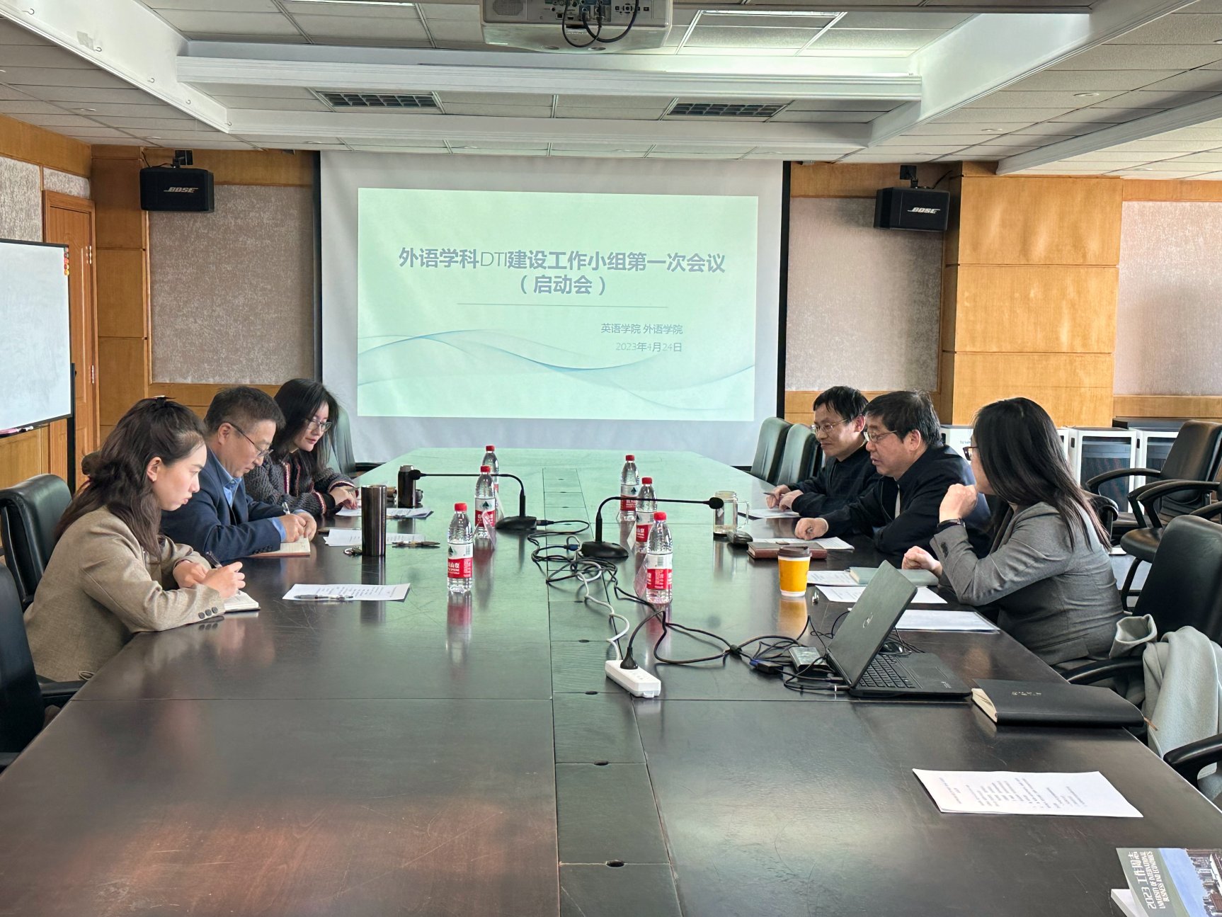 2023年4月24日下午,两院DTI申报工作小组第一次会议在诚信楼1314会议室召开。外语学院院长李运博教授、大象传媒 院长向明友教授、商务英语系主任李琳教授、国际传播系主任钱晶晶副教授、翻译学系王建国教授以及两院科研、学科、研究生教学秘书参加会议。会议由向明友院长主持。