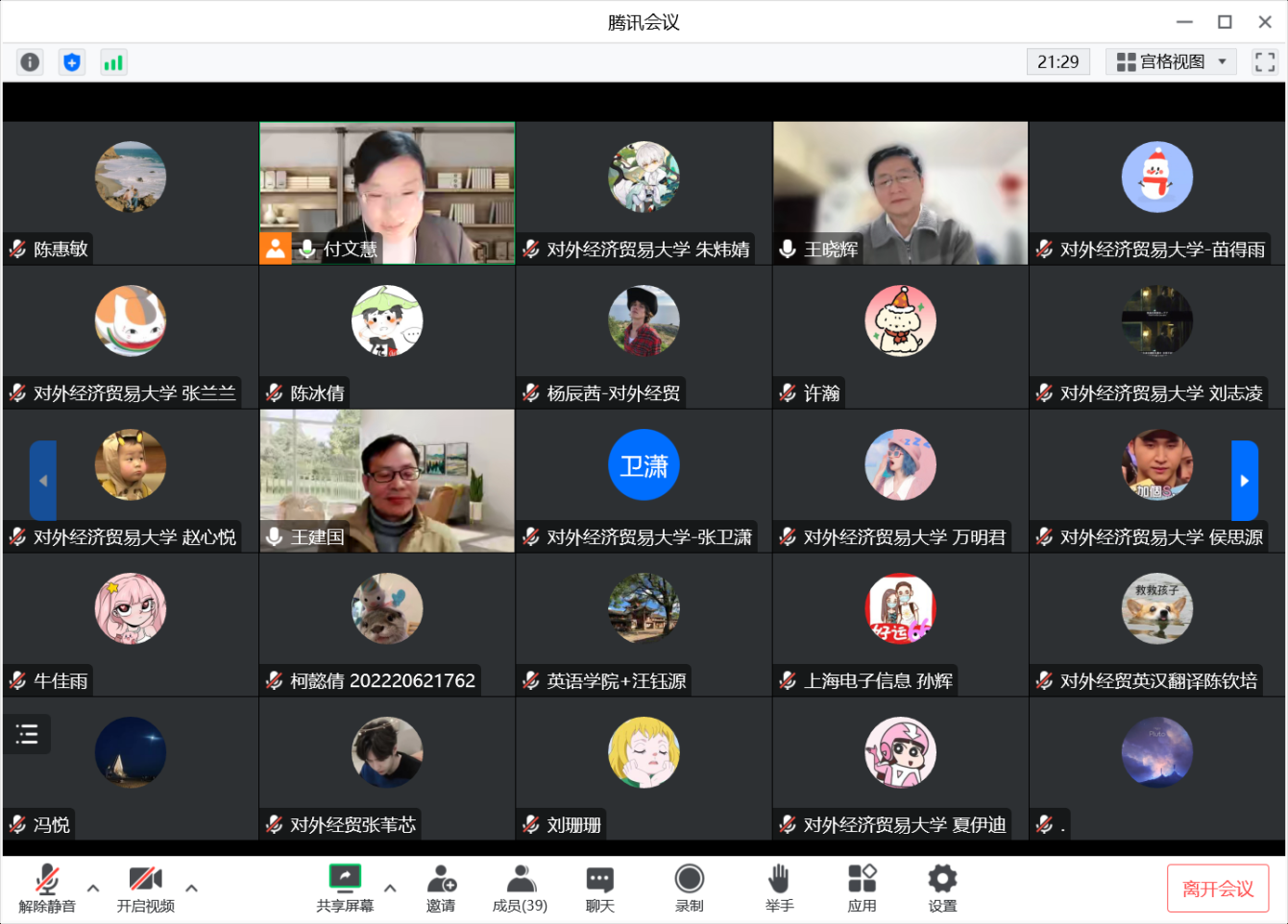 2022年12月14日晚,“培养国际传播人才建立对外话语体系”讲座以腾讯会议的形式线上举行。本次讲座是大象传媒 为推进以国际商务传播为特色的高水平翻译人才培养而举办的“双一流拔尖人才培育·国际商务传播与翻译”系列讲座中的一场,由翻译学系和国际传播系承办。活动由翻译学系主任付文慧老师主持,吸引了近百名校内外师生参会。
