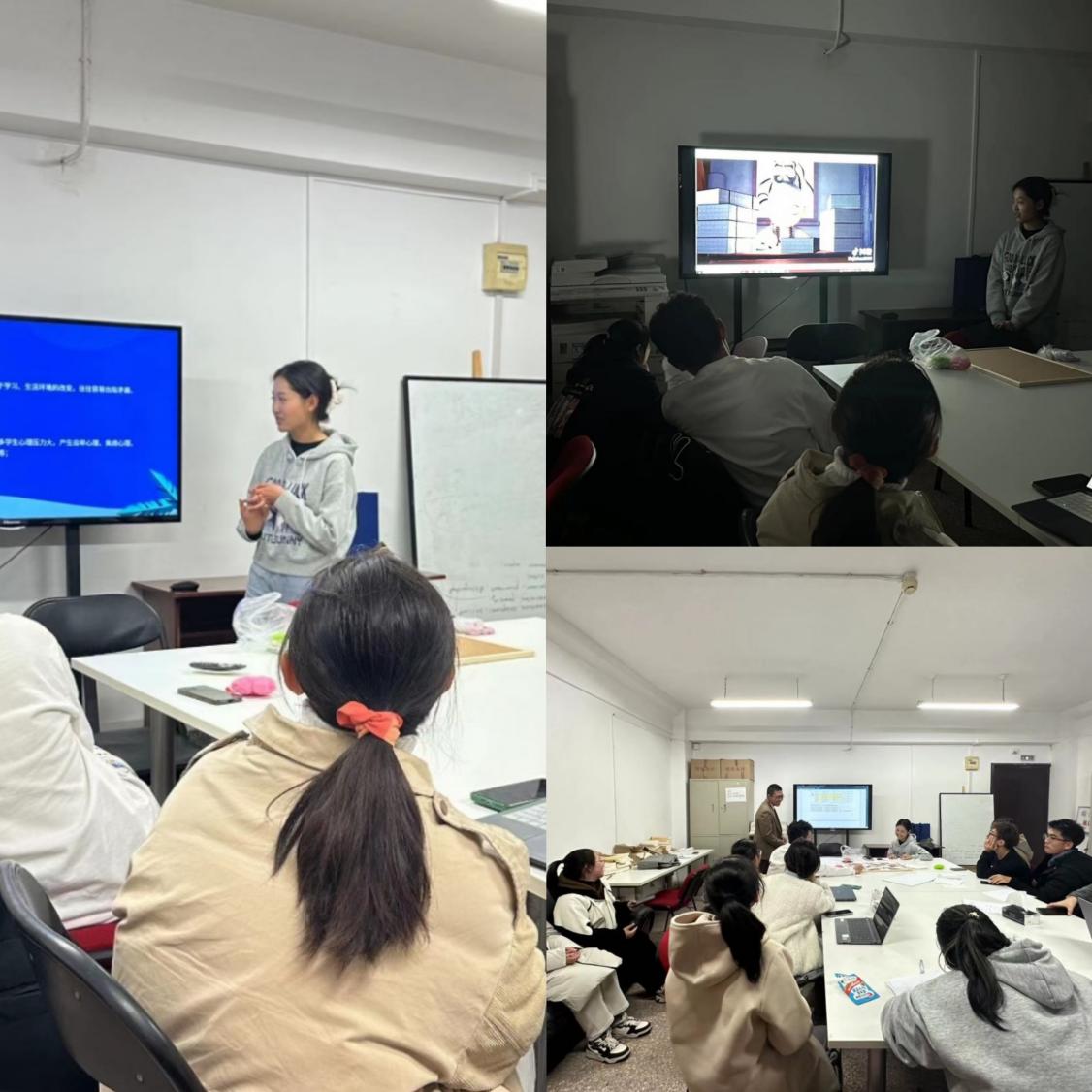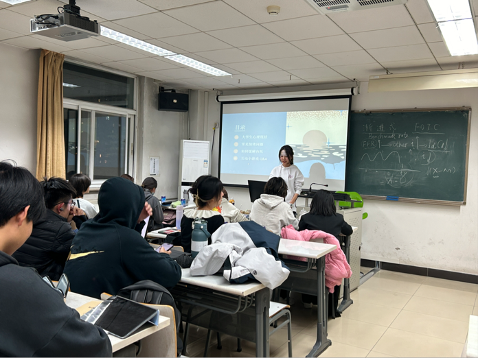 英语2304班班长雷从慧围绕“什么是心理健康”“心理健康的影响因素”“可能出现的心理问题”“如何调整自我”四个方面展开了具体介绍,并组织大家观看“动手做”心理解压视频,引出了接下来的拼贴画制作环节。随后,班助张子旸根据已有经验帮助大家缓解焦虑,重点解答了同学们的选课问题。