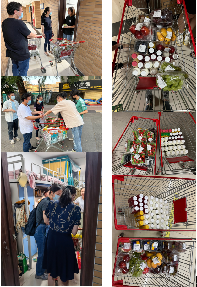 校园封闭管理期间,校内外的辅导员为学生送去贴心服务:他们为多名长期用药同学代为到中日医院完成就诊流程并开具药物,通过西门缓冲区转递给学生;深夜赶至中日医院看望关怀发热学生;承担车长任务,为早上乘车学生购买早饭,在宿舍门口帮助学生拿行李至南门乘车点,做好学生离校送站工作,以爱和关怀送别毕业年级学生。