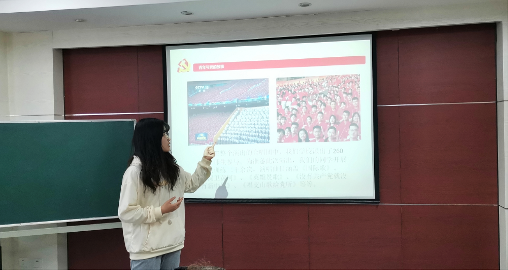 首先,张诗怡同学以参与庆祝中国共产党成立100周年文艺演出《伟大征程》为例,与老党员们分享了青年与党的故事。在此次演出中,我校260余名师生在排练过程中排除万难,牺牲了部分个人利益,圆满完成了此次任务。