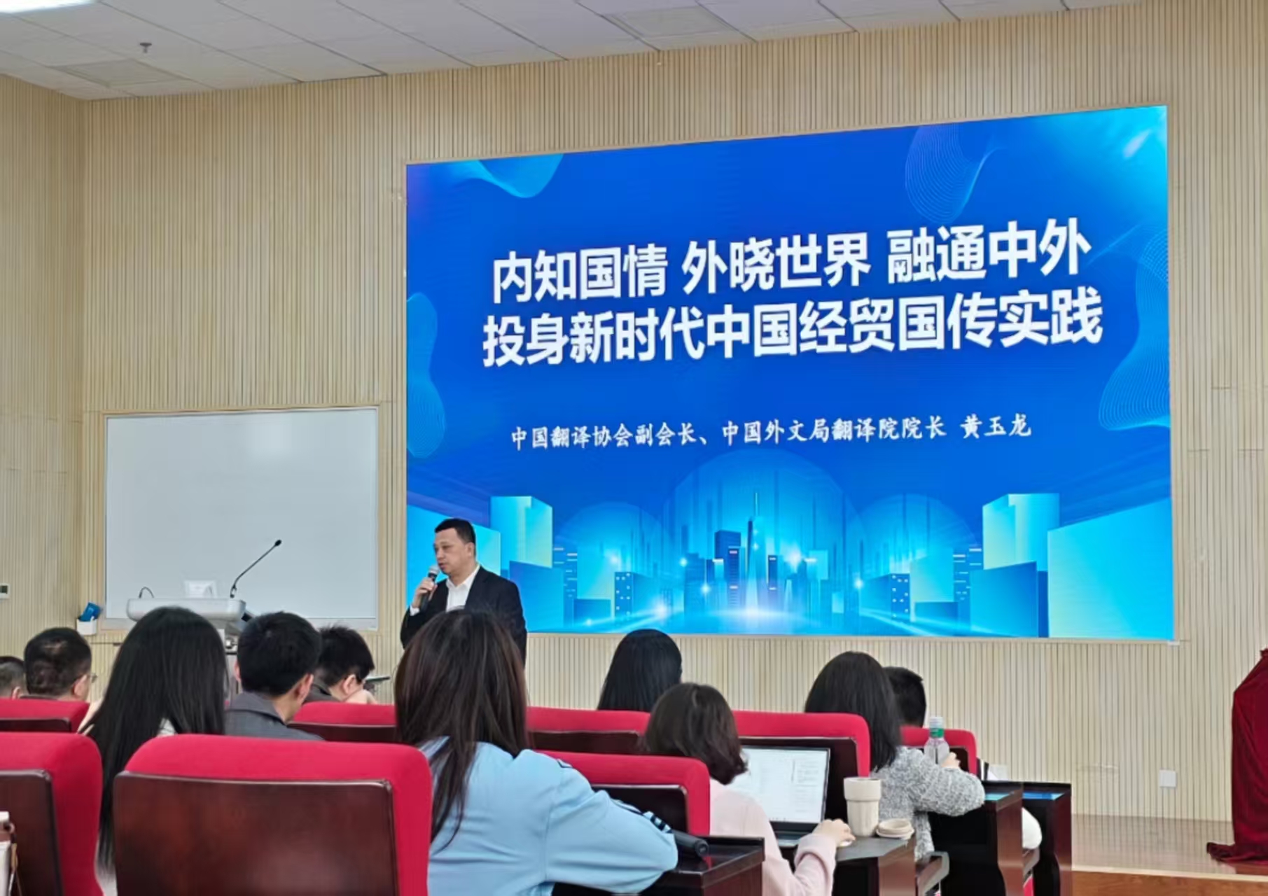 之后,黄玉龙院长为我校本科生、研究生作题为“内知国情、外晓世界、融通中外,投身新时代中国经贸国传实践”的讲座。黄院长强调,新时代“新”在摒弃唯GDP论,倡导环境友好发展;新时代“新”在强化传播主动性与综合性,改变话语体系。新时代国际传播需立足“内知国情、外晓世界、融通中外”的核心理念,突破传统宣传模式,转向“互动式交流”,培养应用型国际传播人才,推动中国话语体系构建,通过进博会等平台树立国家形象,扩大国际影响力。
