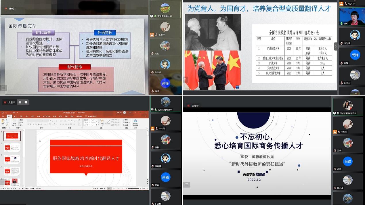 外语学院黄慧教授以“践行外语人的时代使命,向阿拉伯世界传播好中国声音”为主题、聂槟教授以“小语种在国际传播中的大作为”为主题,大象传媒 阎彬副教授以“服务国家战略,培养新时代翻译人才”为主题、钱晶晶副教授以“不忘初心,悉心培育国际商务传播人才”为主题做经验分享,就深入学习领会党的二十大精神、运用外语教师的专业优势在讲好中国故事、培育国际传播人才方面的经验体会,呼吁广大外语教师坚定立场、树立信念,以理论指导实践,不断推动学术研究和社会服务与国际传播实践相互促进,不断提高讲好中国故事的能力,利用外语优势为中国在国际上赢得更多理解、支持;呼吁外语学科教师秉承“为党育人 为国育才”的初心,潜心培育国际传播人才,为新时代中国高水平对外开放培养更多骨干力量。
